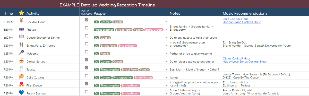 I’ve created the Wedding Reception Timeline Planning Tool to help you plan your celebration! It comes with an example timeline that you can tweak or overhaul to fit your event and lets you easily keep track of who will be involved with each moment and any other essential details. You can also quickly generate a simplified overview timeline to share with guests. I’ve included tips to help your reception flow smoothly and my top music recommendations for each moment. You can access this tool for free and I hope that it is useful to you!